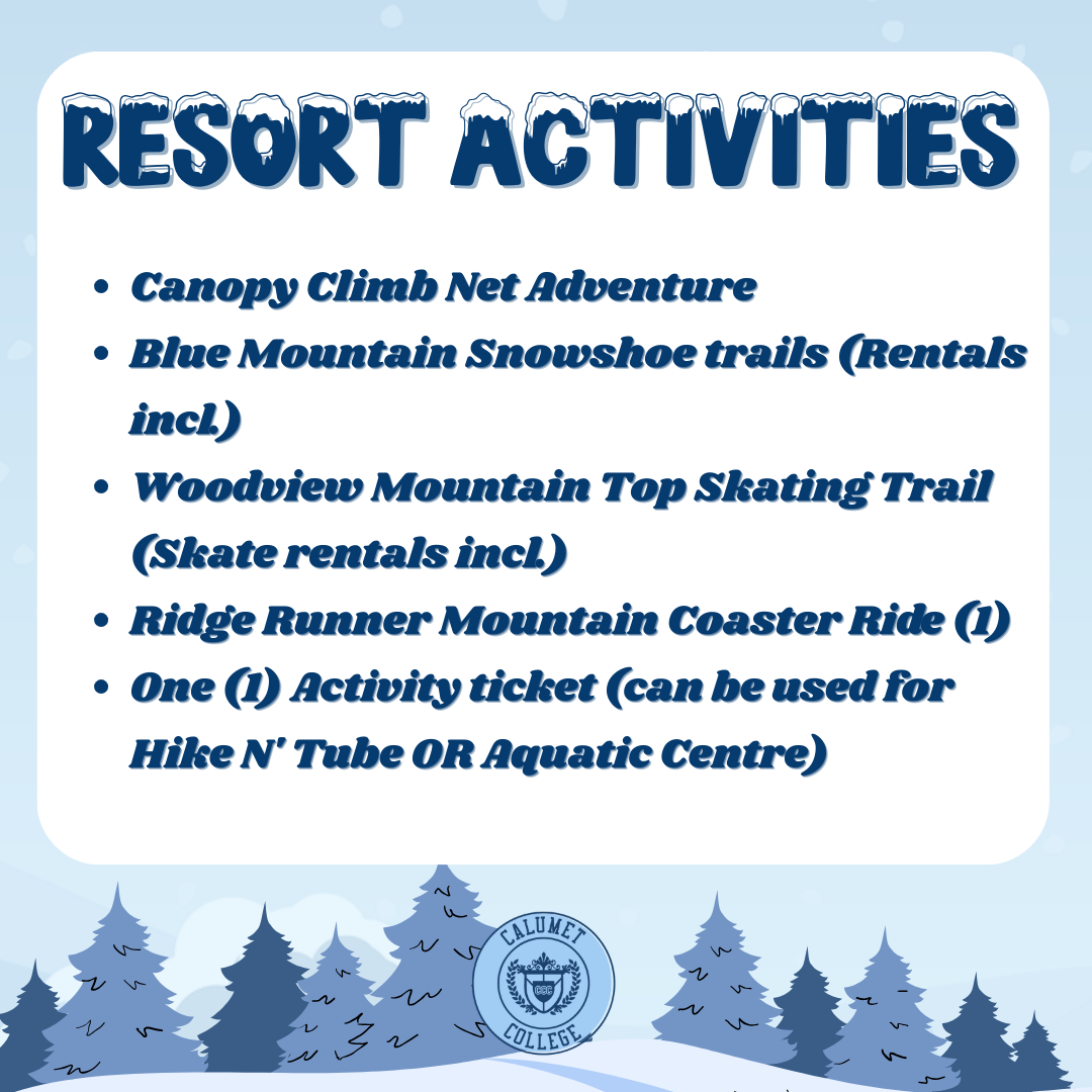 Calumet is taking you all on an adventure to Blue Mountain Ski Resort from February 18th 2026 to February 20th 2026! Come join us for a wintery excursion with fun day activities and more!