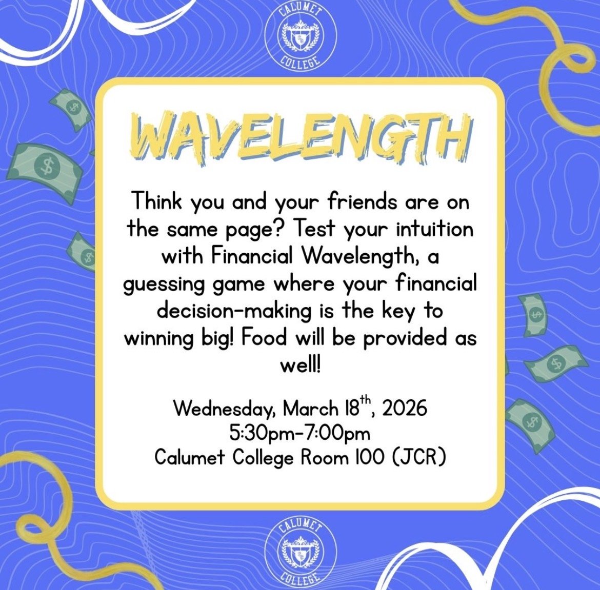 Join Calumet College Council on Wednesday March 18th, 2026 from 5:30PM to 7:00PM in CC100 (JCR) for a fun night you can test your financial knowledge, planned by our amazing finance committee! Wavelength is a game where you can see if you and your friends are on the same page, but this time with a finance twist 💸